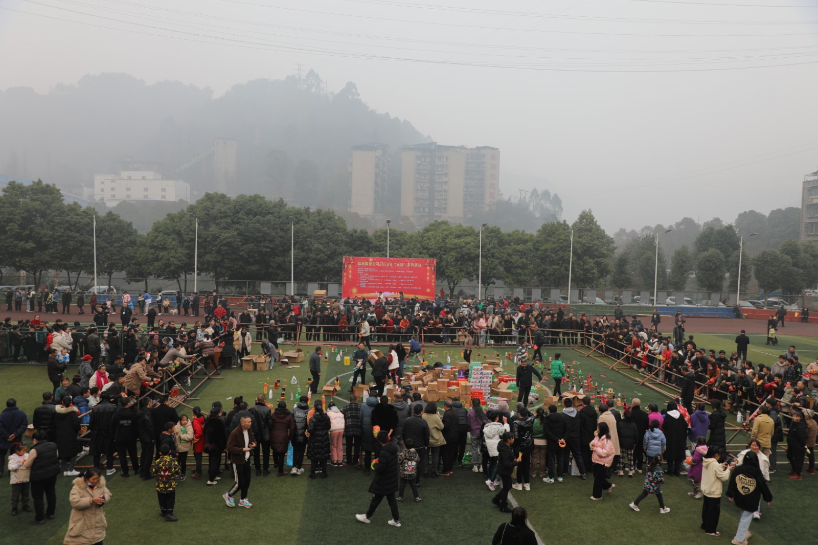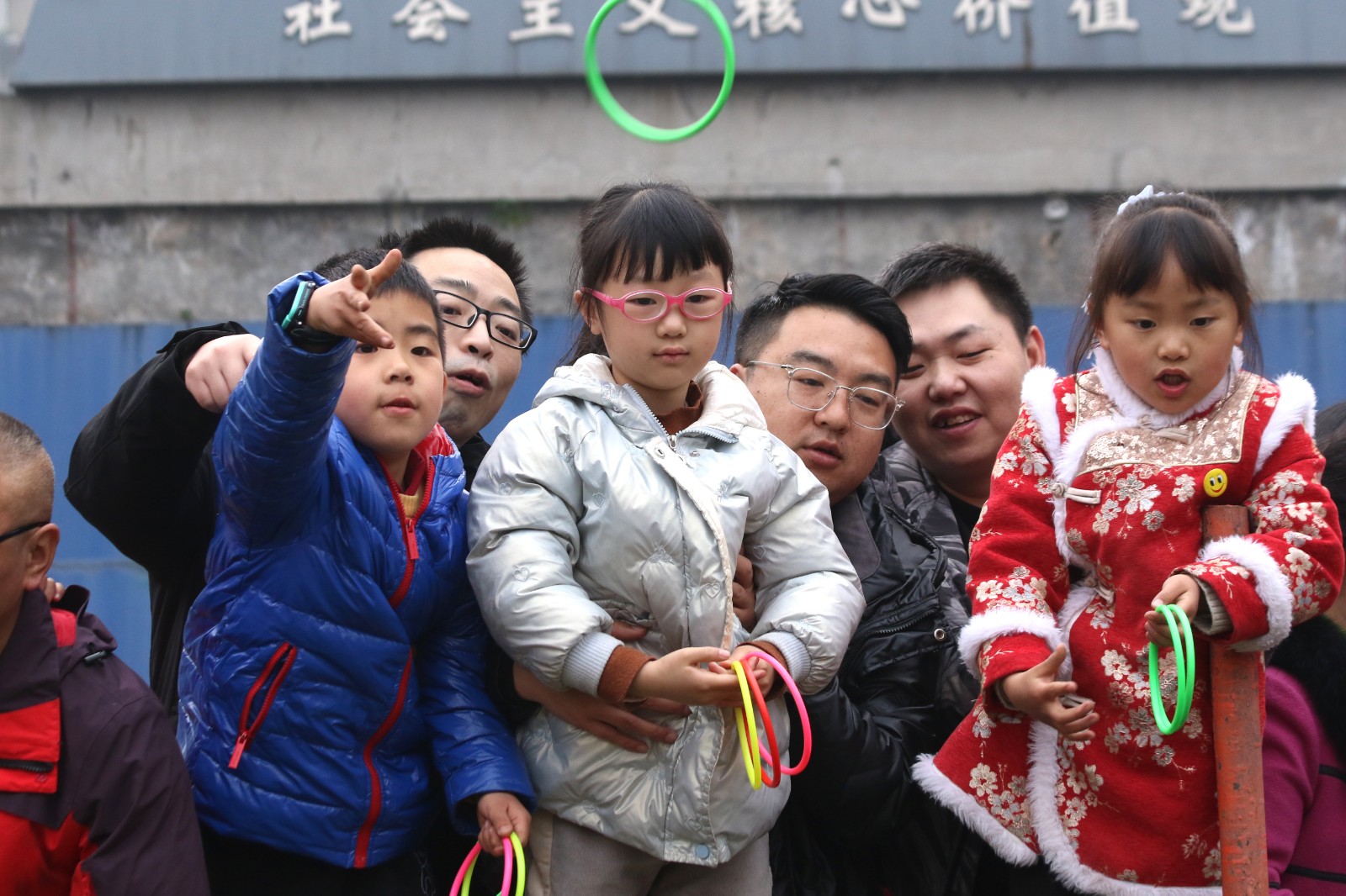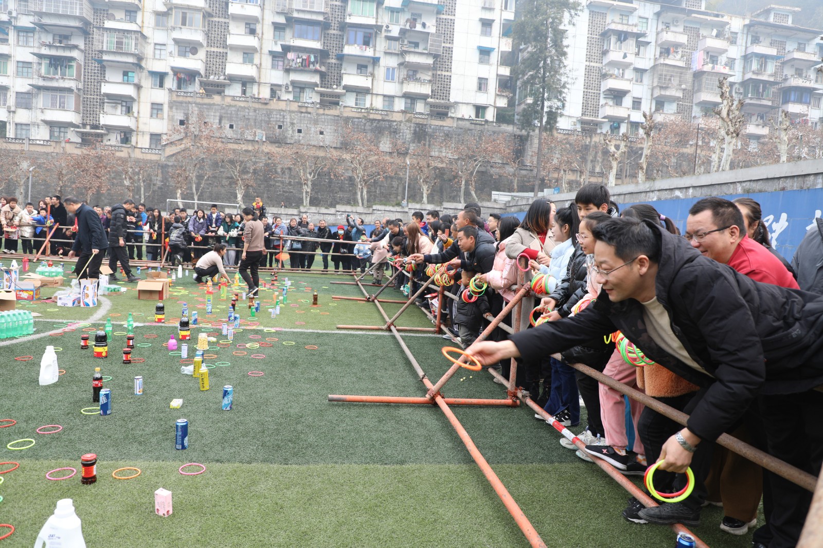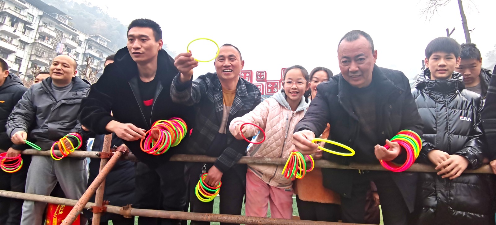 “實(shí)物套圈”與“貳柒拾”爭(zhēng)霸在官斗山足球場(chǎng)同步進(jìn)行,職工們攜妻帶子來(lái)到礦區(qū)“碰運(yùn)氣”。長(zhǎng)方形的活動(dòng)現(xiàn)場(chǎng)圍了個(gè)里三層外三層,等待“出擊”的家屬們,在彩圈售賣(mài)處排起的長(zhǎng)龍繞了兩道彎。凝神聚氣、預(yù)估距離,屏住呼吸、瞄準(zhǔn)目標(biāo),轉(zhuǎn)動(dòng)手腕、用力一揮,天空中快速閃過(guò)一道道美麗的拋物線。有套中目標(biāo)豐收喜悅的歡呼,有擦肩而過(guò)的嘆息與加油。套上三兩瓶好酒,回家過(guò)個(gè)熱鬧年,無(wú)論老少,眼里都是希望。