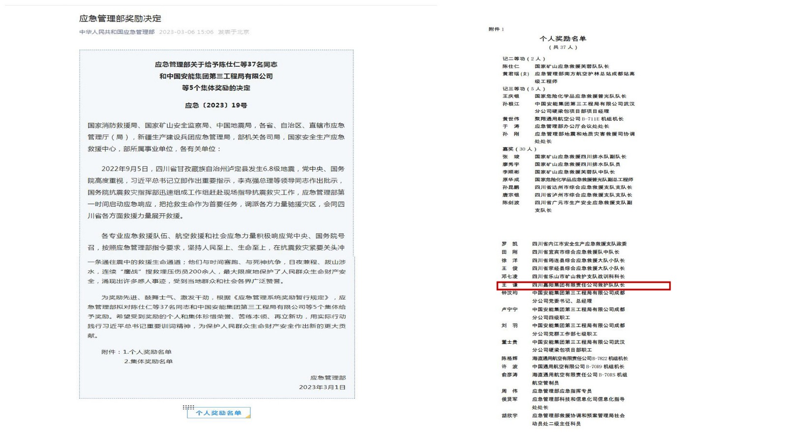 近日,應(yīng)急管理部[2023]19號(hào)文件下發(fā),對(duì)瀘定抗震救災(zāi)表現(xiàn)突出的個(gè)人和集體進(jìn)行獎(jiǎng)勵(lì),嘉陽(yáng)集團(tuán)礦山救護(hù)隊(duì)隊(duì)長(zhǎng)王謙榜上有名。