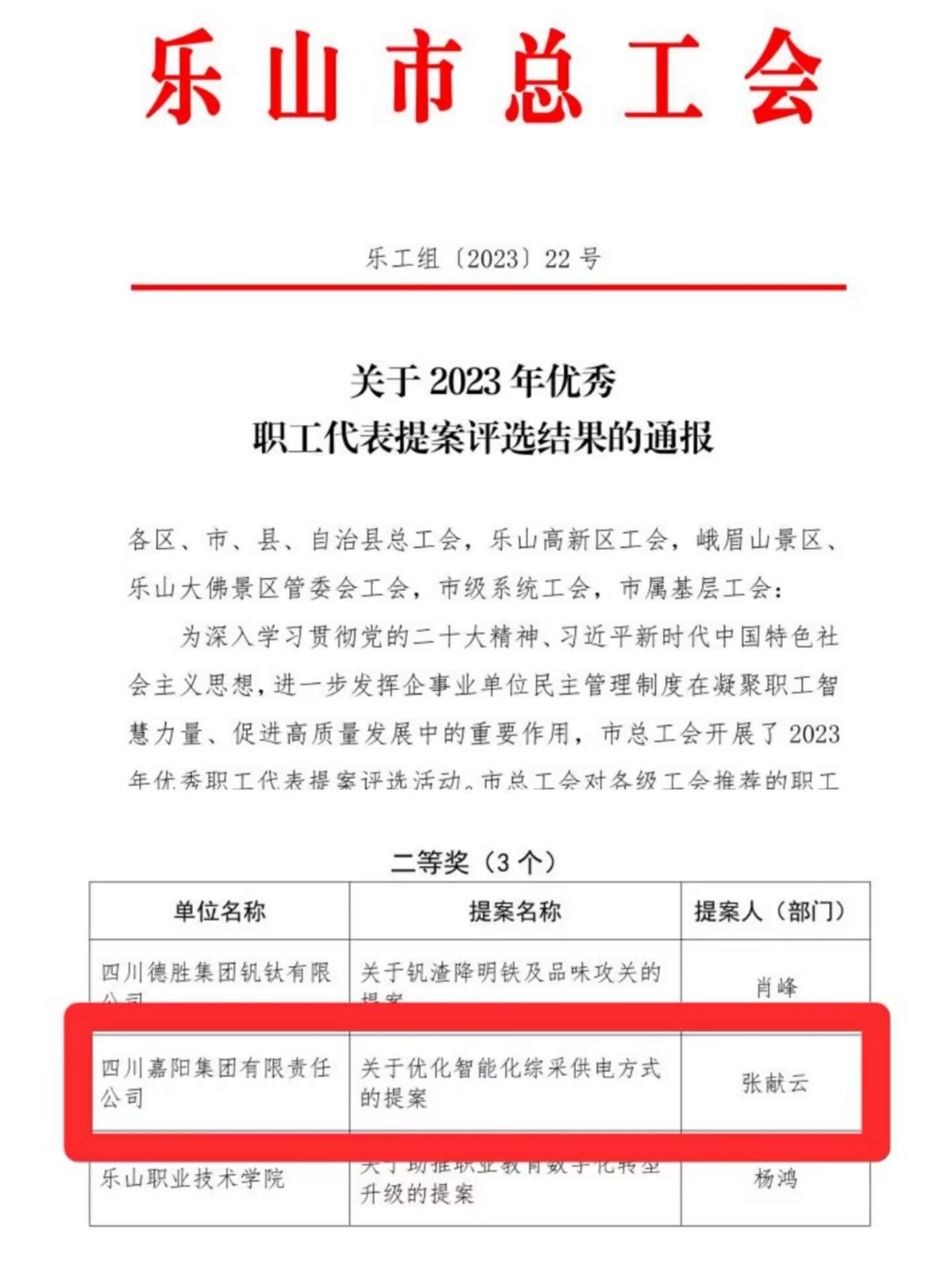 日前,嘉陽煤礦采煤二隊(duì)技術(shù)員張獻(xiàn)云在樂山市總工會開展的2023年優(yōu)秀職工代表提案評選活動中斬獲二等獎,集團(tuán)工會獲得優(yōu)秀組織獎。