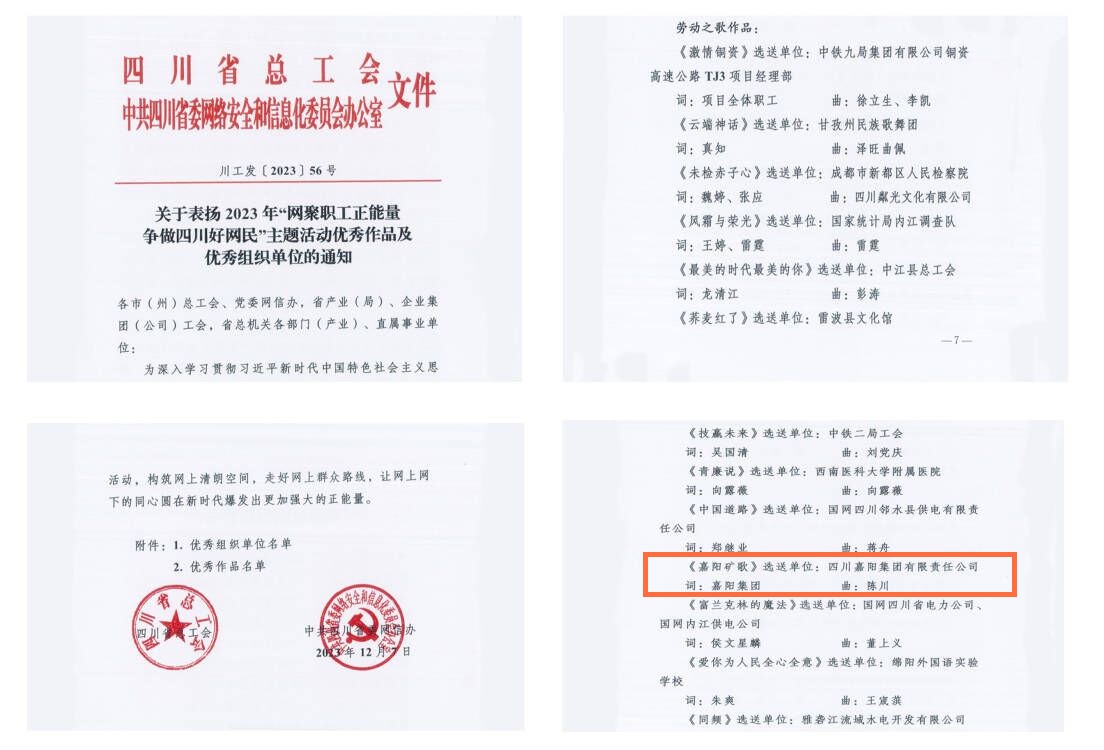近日,四川省總工會下發(fā)《關(guān)于表揚(yáng)2023年“網(wǎng)聚職工正能量爭做四川好網(wǎng)民”主題活動優(yōu)秀作品及優(yōu)秀組織單位的通知》,由嘉陽集團(tuán)報(bào)送的視頻《嘉陽礦歌》獲勞動之歌作品獎。