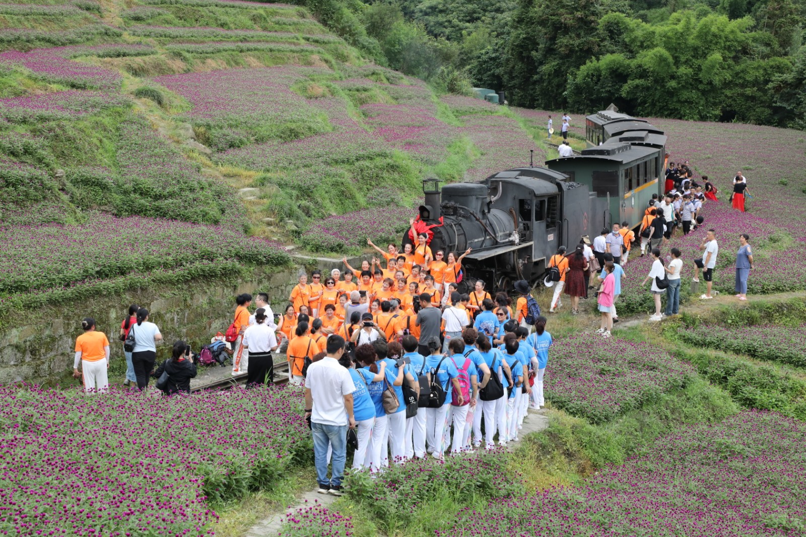 時(shí)下的芭石鐵路段家灣,千日紅花開正艷,漫山遍野的紫色精靈跳躍在山野間,層次分明,錯(cuò)落有致,與冒著蒸汽、吐著白煙的小火車相映成趣。這列承載著歷史記憶的蒸汽小火車在繚繞的白煙中,緩緩駛過(guò)花海,讓人仿佛穿越時(shí)空回到了那個(gè)純真而質(zhì)樸的年代?;顒?dòng)現(xiàn)場(chǎng)即興的文藝表演,“小火車喚我去嘉陽(yáng)”的歌曲對(duì)唱與“大海航行靠舵手”的舞蹈表演為靜謐的山野平添了一份生動(dòng)與活力。讓游客在賞花之余,感受到更多的歡樂與溫馨。