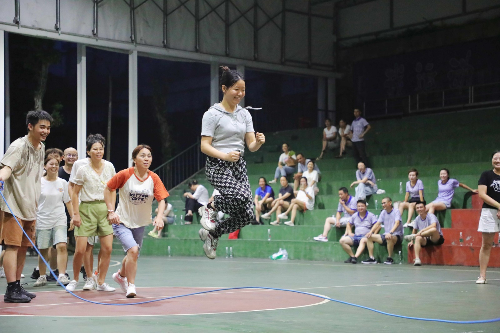 此次趣味運動會精心設置了一系列妙趣橫生的項目,包括“跳大繩接力”“步調(diào)一致”“海底傳月”“滾鐵環(huán)接力”“地上投籃”,吸引廣大職工的熱情參與?!凹佑停瑳_沖沖!”在圍觀職工家屬的助威聲中,滾鐵環(huán)的隊員像箭一樣沖出去,鐵環(huán)倒了立馬撿起來重新出發(fā),一刻也不猶豫。隊員一個接一個地出發(fā),交接的是鐵鉤鐵環(huán),傳遞的是童年時的快樂,歡快的加油助威聲浪帶火了比賽,讓參與者玩嗨了,圍觀者也樂翻了?!疤罄K接力”項目每一次跳躍都盡顯風采,也跳出了許多有趣的“表情包”;“步調(diào)一致”項目協(xié)力而行,賽場上的每一句“左右左”都喊在了榮耀之路上。