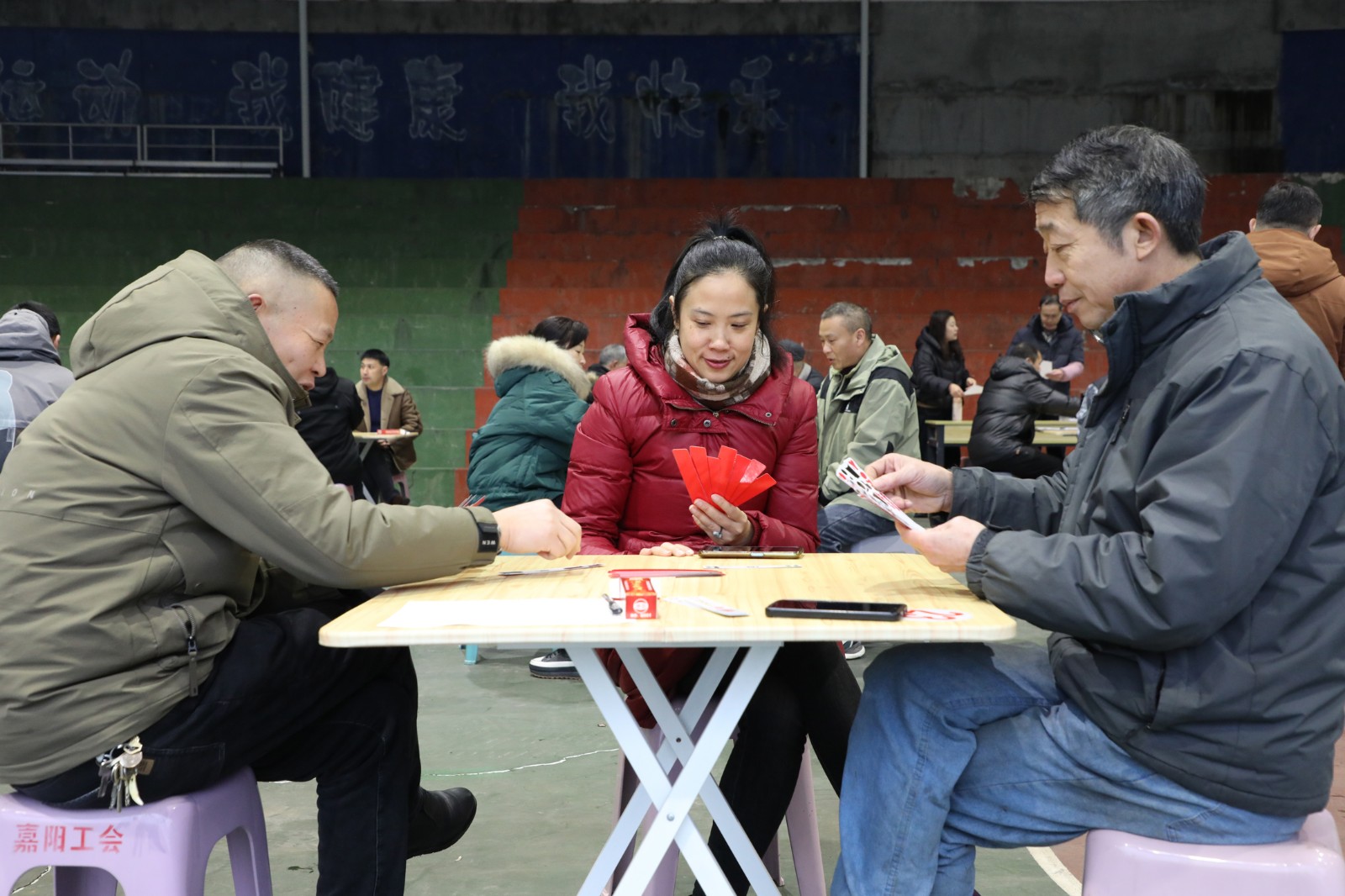上午8時30分,“貳柒拾”字牌比賽拉開戰(zhàn)幕。來自各單位的81名字牌愛好者現(xiàn)場抽簽組隊。比賽中,大家時而眉頭緊鎖,時而面露微笑,比賽既講運氣、又考實力,參與者沉浸其中,享受著競技的樂趣。