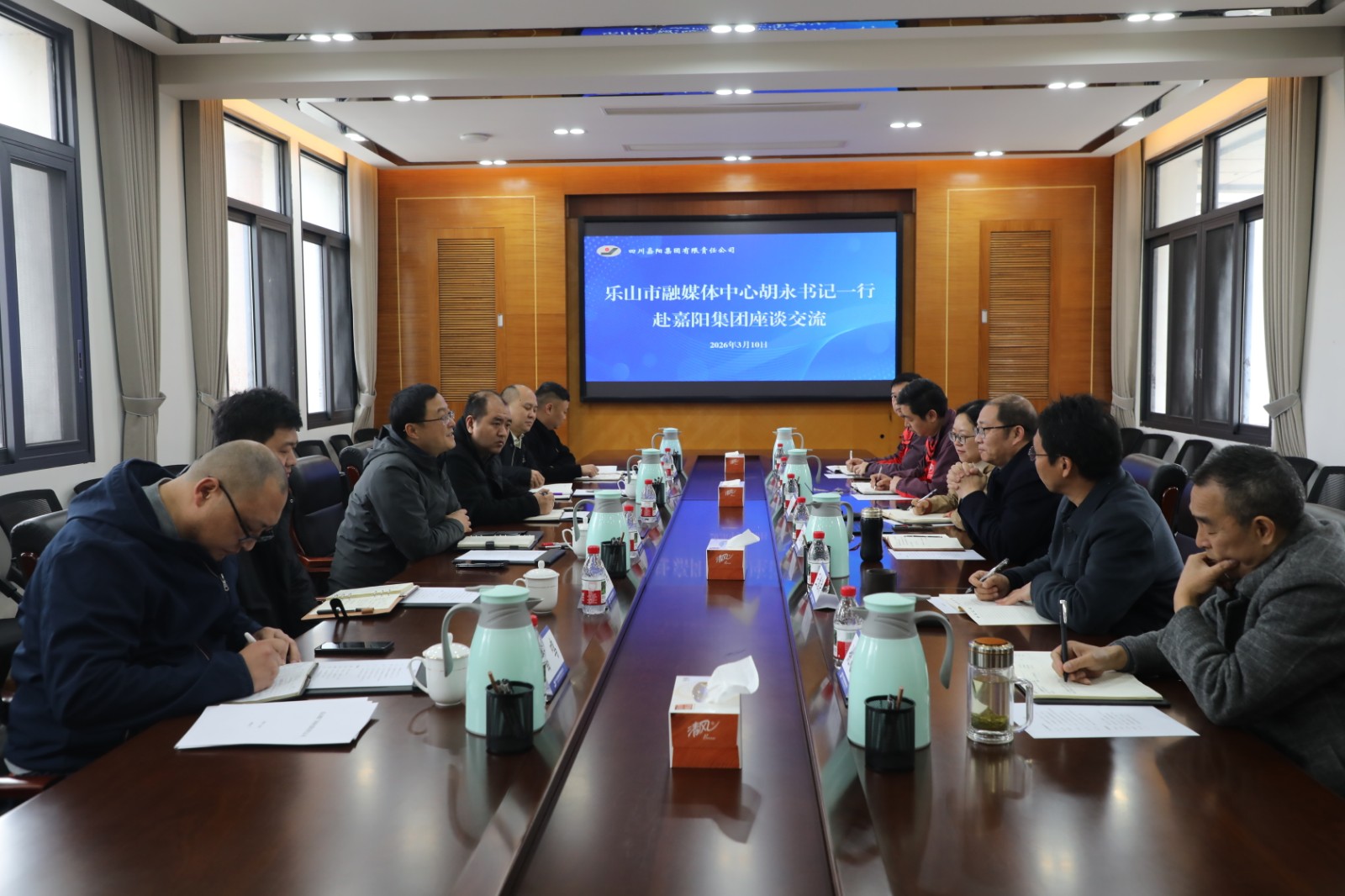 3月11日,樂山市融媒體中心黨委書記、主任胡永一行到公司交流,雙方圍繞企業(yè)文化建設(shè)、品牌形象傳播、文旅業(yè)態(tài)打造等方面展開交流。公司黨委書記、董事長范勤英,黨委副書記、工會主席王維洪及相關(guān)負(fù)責(zé)人陪同交流。