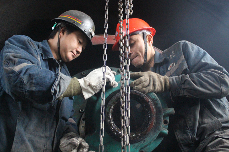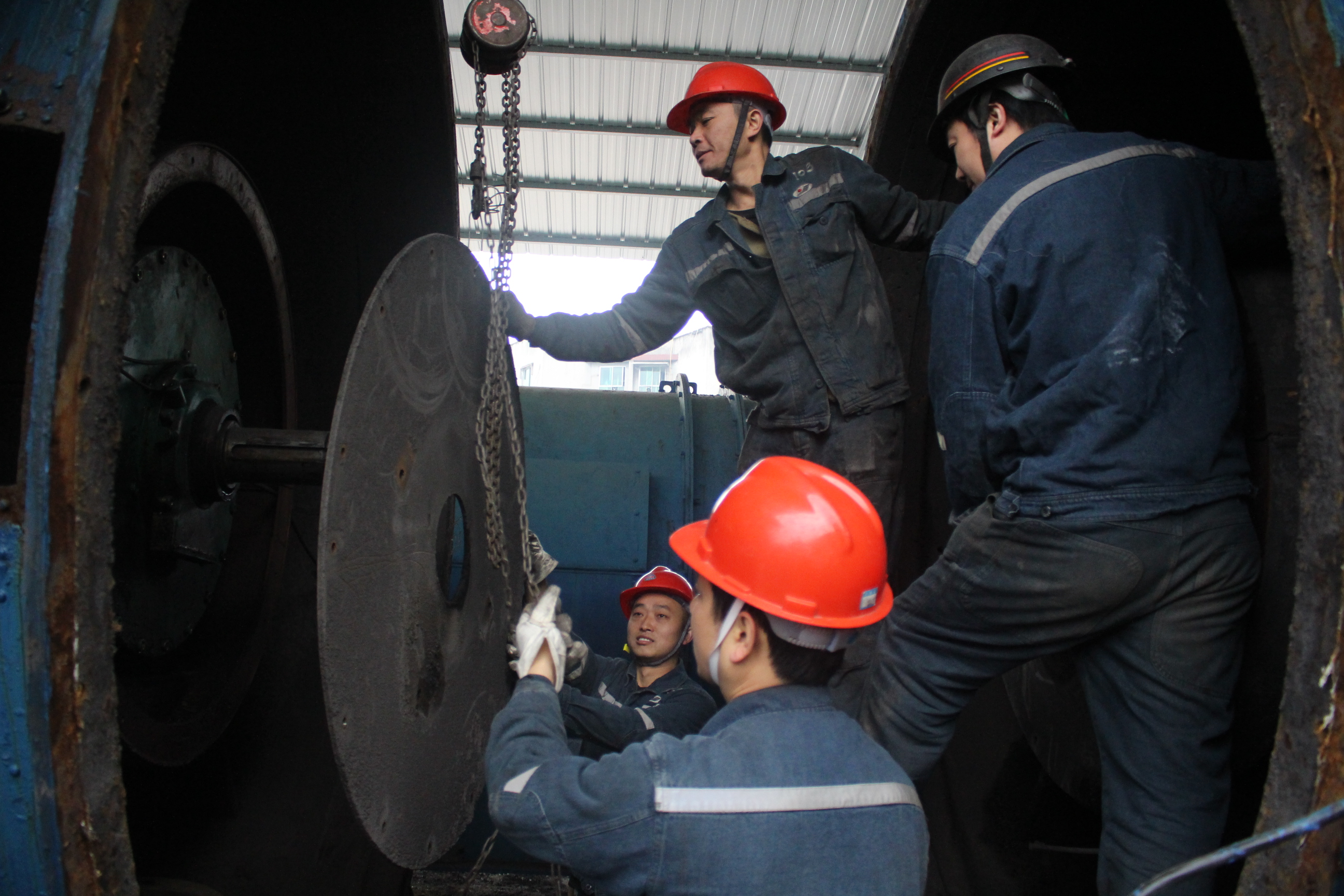 碩大體積的主要通風機打開“體腔”工序多、操作環(huán)節(jié)多,而現場工位受限并非人越多越好,況且故障時間是中班,結合班組實情,機電隊電鉗工在隊管的組織下拉開了接力檢修的序幕,從故障發(fā)生起,多名電鉗工與時間賽跑,搶進度、找根源、除病灶,現場用手動葫蘆拉主機、打開主機腔體、拆除風輪、清除受損葉片、檢查軸承、維護防爆圈、打磨變形軸、清理備用配件、新風葉對應編碼……,一級供電負荷的“康復”之旅盡在這些忙碌的身影中,沒有專業(yè)的無影燈,只有普通的礦燈,束束光亮點綴著一幅新的勞動畫卷;沒有干凈衛(wèi)生的手術臺,只有冷冰冰的材料和工具,并不整潔的搶修現場,那專注的神情和一絲不茍的技術鉆研精神卻在這里展現的淋漓盡致!