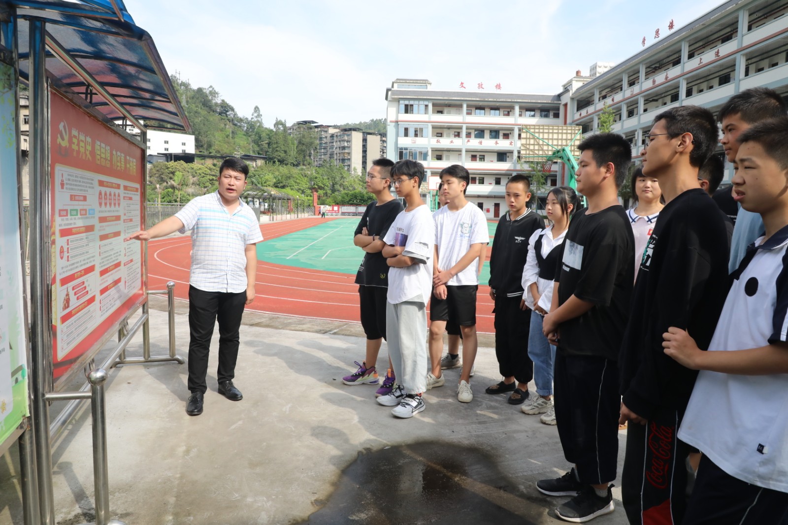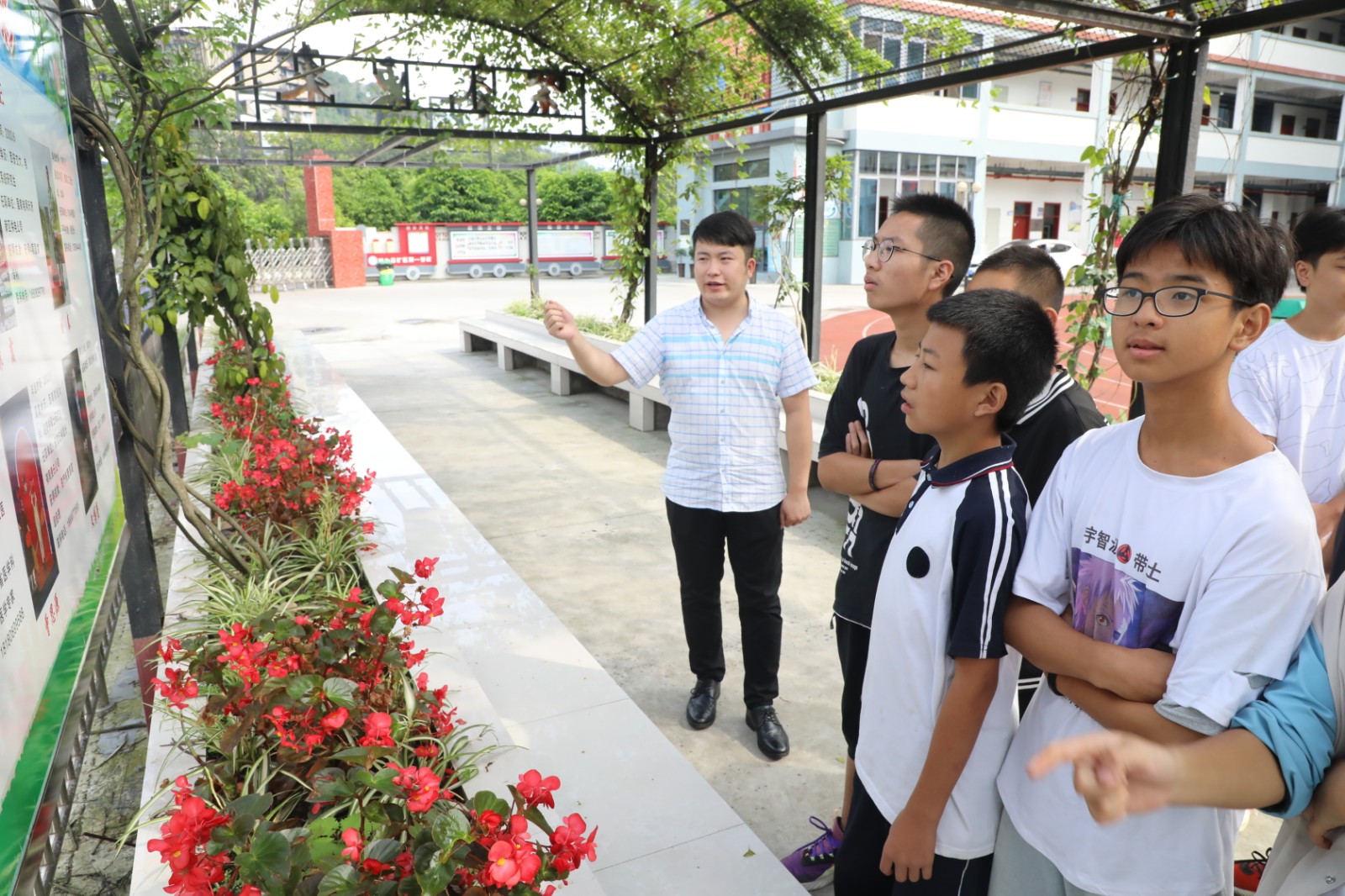文化長(zhǎng)廊由集團(tuán)公司負(fù)責(zé)施工建設(shè),主體結(jié)構(gòu)采用軌道鋼搭建全長(zhǎng)50米,廊下兩排坐椅方便學(xué)生休憩、晨讀,長(zhǎng)廊四周以串串紅、紫藤等花草點(diǎn)綴,取名“暢亭”,立足自身實(shí)際,文化長(zhǎng)廊設(shè)計(jì)有“黨史學(xué)習(xí)”“紅色小故事”“學(xué)校發(fā)展史”“校友風(fēng)采”等多個(gè)版塊,圖文并茂、生動(dòng)形象,讓黨史知識(shí)、校園文化鮮活地呈現(xiàn)在師生們面前。不僅有利于校園文化氛圍的營(yíng)造,還有利于了解黨的歷史和發(fā)展歷程,傳承偉大的建黨精神。切實(shí)提升學(xué)生思想政治教育的針對(duì)性和實(shí)效性,有效激發(fā)了黨史學(xué)習(xí)教育的熱情。