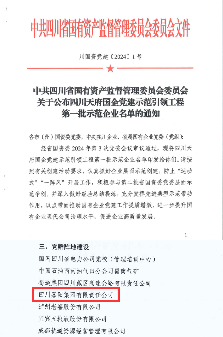 近日,省國資委黨委以川國資黨建〔2024〕1號文件公布四川天府國企黨建示范引領(lǐng)工程第一批示范企業(yè)名單,四川嘉陽集團有限責任公司榜上有名。