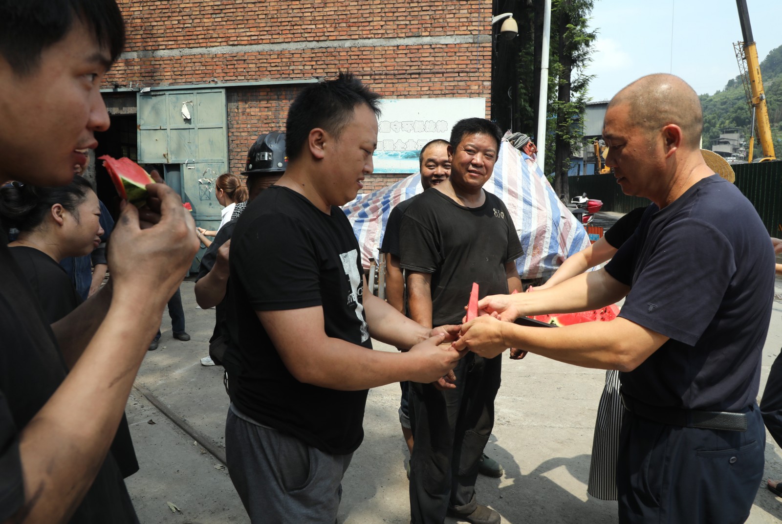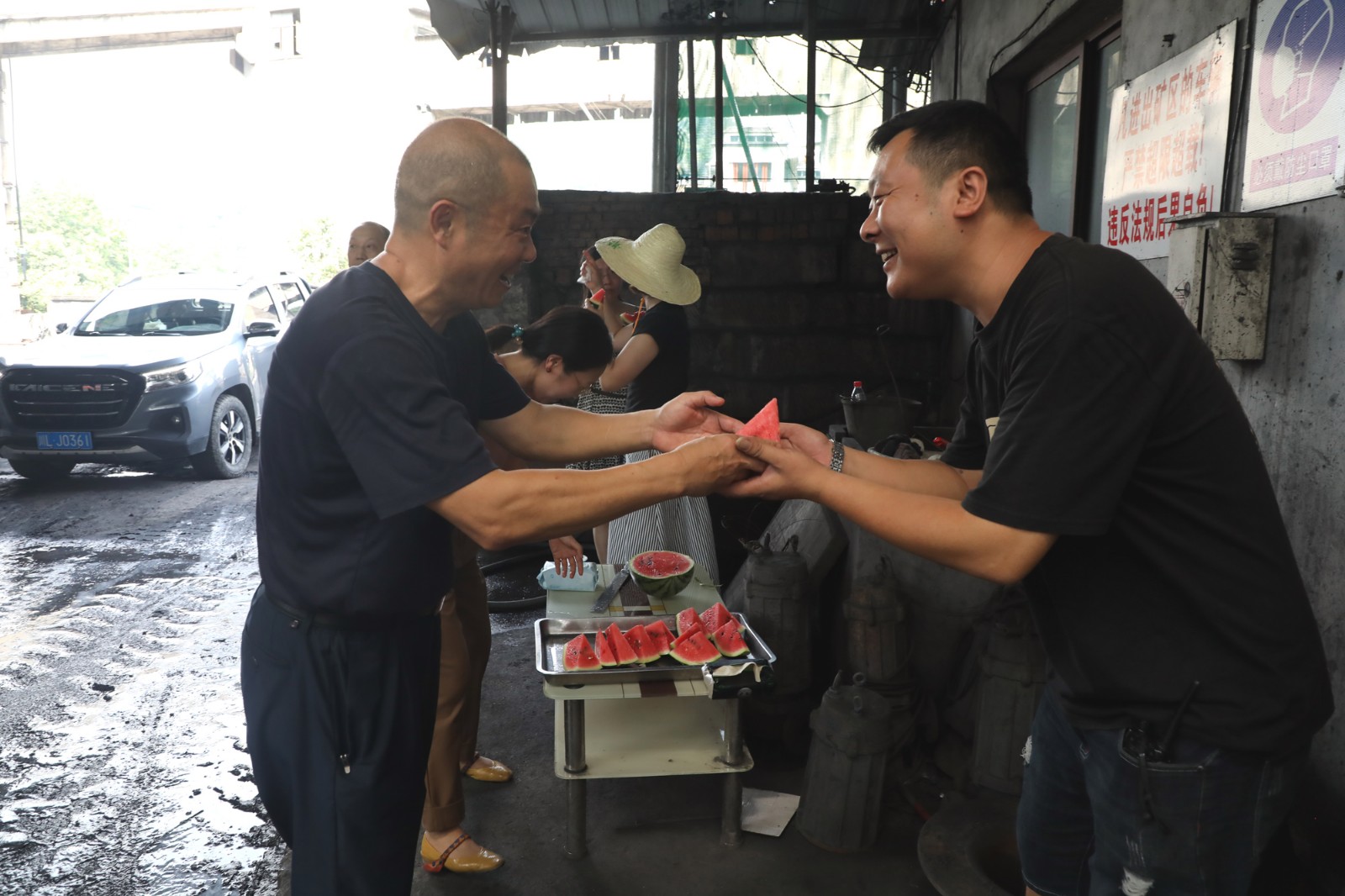 進入8月,高溫天氣持續(xù)作威,高溫作業(yè)的職工異常辛苦。范勤英帶領機關第三黨支部的黨員們來到高溫一線,看望煤礦機電隊機組班、炭壩高溫作業(yè)的職工?!皫煾祩冃跉猓詨K西瓜涼快下,吃碗冰粉解下暑”,范勤英一邊招呼正在辛勤工作的職工們,一邊為他們送上清甜可口的西瓜、涼爽解暑的冰粉,關切地詢問他們在高溫時段的作業(yè)情況,叮囑他們一定要合理安排作息時間,有效預防中暑,切實保障自身安全。同時要求煤礦黨政工團切實采取職工防暑降溫措施,最大限度減少高溫天氣給職工身心健康帶來的影響,確保他們平安度夏。