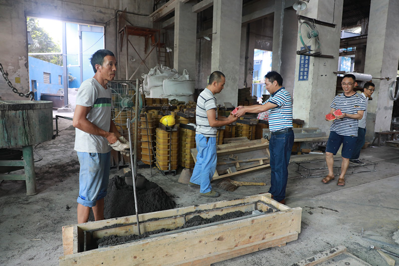 在副總經理王維洪、袁成金的帶領下,機關二支部的黨員代表們帶著西瓜、礦泉水等防暑降溫物品來到機電制造維修分公司,走進裝配車間、精工車間、鑄造車間、預制車間,看望慰問奮戰(zhàn)在高溫環(huán)境下的一線職工,為他們送去清涼與關懷。在裝配車間,副總經理王維洪為正在辛苦工作的工人師傅們送上礦泉水,叮囑他們天氣越熱越要多喝水,同時提醒大家要合理調整作息時間,注意勞逸結合,確保安全度夏。來到精工車間,副總經理袁成金向忙碌的工人師傅們一邊道著辛苦一邊遞上西瓜,“歇一歇,吃塊西瓜涼快一下!”關懷的話語沁人心脾,清涼傳遞到了四個車間里的每個職工身上。兩位領導要求機電分公司主管領導一定要做好防暑降溫工作,在確保職工們安全、健康的前提下組織生產。