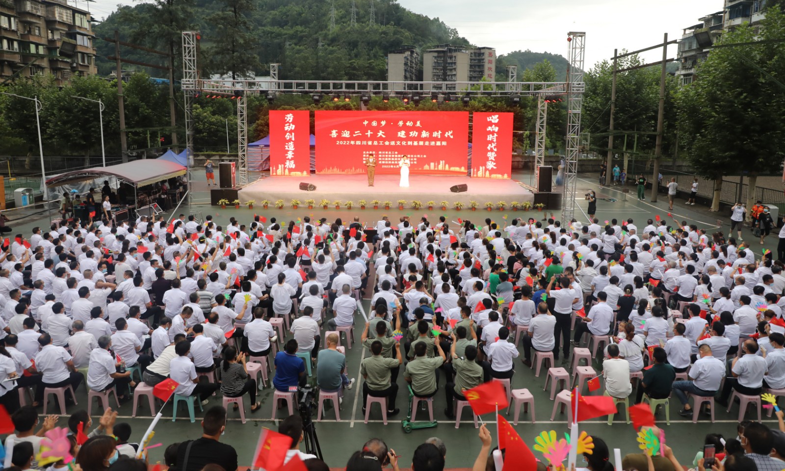 驟雨停歇,晚霞如畫。6月23日晚上7點(diǎn)半,2022年四川省總工會(huì)送文化下基層“中國夢 勞動(dòng)美——喜迎二十大建功新時(shí)代”走進(jìn)嘉陽文藝晚會(huì)在礦區(qū)官斗山體育場舉行,為職工家屬帶來了一場精彩紛呈的文化大餐。